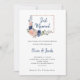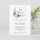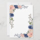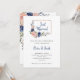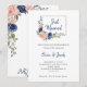 Convites para brunch pós-casamento modernos e elegantes apresentam flores desenhadas à mão em aquarela azul-marinho e rosa-claro. Muitas folhas verdes botânicas e folhagens adornam os buquês. Há também uma moldura geométrica retangular com aparência de rosa dourada falsa e uma escrita moderna à mão que diz "casados".
