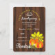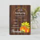 Ao estilo russo do país Amizade, convite agradecido com bonito flores amarelas ensolaradas e abóboras laranja no efeito de grãos de madeira escura.