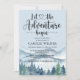 Que a aventura comece o temático convite do chá de fraldas azul de aquarela com florestas e montanhas paisagem selvagem com tipografia de escrita de caligrafia com coração no meio. Consulte o cheio de produtos para este design em: https://www.zazzle.com/collections/forest_adventure_baby_shower-119311648144421112