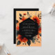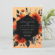 An artistic display of moody botanicals sets a dramatic tone for your nuptials. This painterly design features vibrant rust-orange roses and deep crimson blossoms, artfully arranged against a warm apricot backdrop. Dark, charcoal-hued foliage provides a striking contrast, creating an elegant and romantic atmosphere.