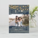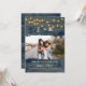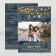 Celebre seu amor com esta foto rústica salve o cartão de data com um fundo de madeira de marinho, luzes brilhantes de cordas e suas iniciais com um detalhe cardíaco. O layout de foto em largura de cheio adiciona um toque pessoal enquanto o charme do país o torna ideal para casamentos de fazenda, ocidentais ou de celeiro. Personalize com os seus nomes, data e local para criar um keepsasaokos que os convidados adorarão.