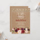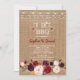 Cartão de design único, rústico, com uma bela tipografia de CHURRASCO I DO (letra O substituída por um anel), corações para iniciais, luzes de cordas, cor d'água, buquê floral vermelho borgonha, sobre um fundo burlap. Use a ferramenta Personalizar para adicionar suas informações. Veja, também, minha coleção I DO CHURRASCO Chalkboard/Barn e Gingham.