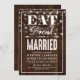 RUSTIC WEDDING MODELO com fundo de madeira rústico, luzes de brilho românticas, as palavras "EAT, DRINK AND BE CASAR" e seus detalhes de casamento.
