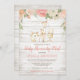 Bons animais de floresta russa convite a chás de fraldas de meninas com raposa, veado e coelho. Bonito flores cor-de-rosa e cor-de-água de pêssego decoram o topo e um fundo de madeira de celeiro claro adiciona um design de pintura cinzenta.