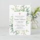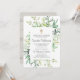 Composto por tipografia serif. Tudo contra um pano de fundo branco com folhagem verde com cruz de ouro falso. A parte traseira da carta tem um design de painel de madeira.