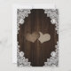Rustic purple and blue floral wedding invitation featuring two floral hearts on a barn wood background adorned with white floral lace and string lights. Perfect card design for inviting your guests to your purple and blue rustic wedding party.
