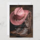 Uma imagem lindamente composta captando a essência de um casamento country, apresentando um par de botas castanhas bem detalhadas, em conjunto com um chapéu de cowboy de cor rosa. Colocada contra um pano de fundo robusto de couro, a cena evoca charme, tradição e elegância ocidental — perfeita para a noiva ou noivo moderno que está trazendo um pequeno talento rural para o seu grande dia.