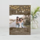 Defina o tom para o seu grande dia com esta foto rústica, salve o cartão de data com seu monograma, luzes brilhantes de cordas e uma textura de madeira de celeiro com um quadro fotográfico estilo pincelada. Perfeito para casamentos de campo, fazenda, ou ao ar livre, esta carta personalizada destaca sua foto favorita de noivado enquanto a mantém maravilhosamente na Terra e romântica.