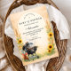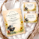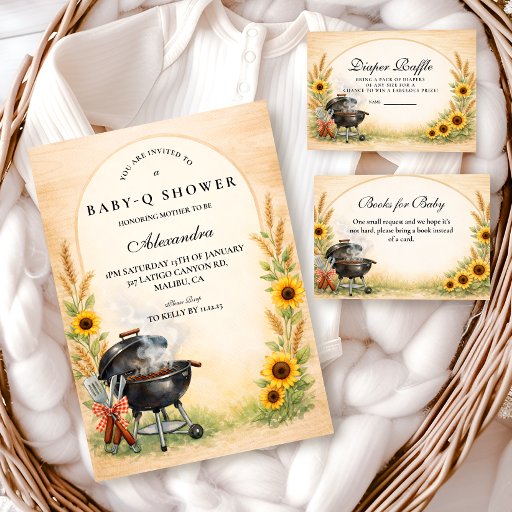 A warm farmhouse-inspired Baby-Q design featuring golden sunflowers, soft wheat stalks, and a watercolor charcoal grill scene. The neutral parchment background creates a cozy countryside feel while the illustrated cookout details add playful charm. The arched layout keeps the center clean and elegant for event wording, framed by rustic harvest elements along the sides. Perfect for a fall or late-summer outdoor baby shower with country warmth.