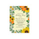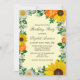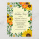 Convite de aniversário russo, com girassóis vibrantes, margaridas brancas tradicionais e flores cor de laranja contra fundo amarelo claro com sopro de bebê e acentos botânicos verdes