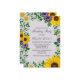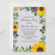 Convite de casamento russo com girassóis vibrantes, margaridas brancas tradicionais e flores roxas coloridas contra fundo roxo leve com sopro de bebê e sotaques botânicos verdes