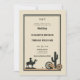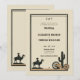 Um convite de casamento rústico para vintage, com um quadro elegante e simples e uma letra ocidental, bem como ilustrações vintage de um vaqueiro a cavalo, uma roda de carrinho e outros elementos ocidentais do país. Romântico e charmoso, é uma escolha encantadora para um casamento de celeiro, um casamento ao ar livre, um casamento de churrasco ou qualquer lugar rústico com um tema de casamento country western, cowboy.