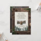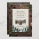 Modern rustic winter wedding invitation with photo and watercolor pine forest design, featuring snowy evergreens, warm wood background and elegant typography, fully editable template for names, date, venue and RSVP.