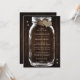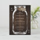 Convite de casamento russo com um jarro de mason e corações de burlap em um fundo de madeira.