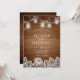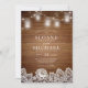 Este convite de casamento rústico mostra um fundo de madeira rústica com uma delicada borda de renda ao longo do fundo. A imagem de cima inclui potes de pedras e luzes brilhantes; perfeito para um tema de casamento ao ar livre.