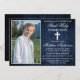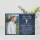 Rustic Blue Wood Primeiro Convite Comunitário Sagrado com Cruz e Foto.