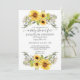 A essência do estilo rústico de fazenda. Flores de girassol de cor aquosa à mão, acompanhadas de folhagem de eucalipto, sementes e arcos verdes acima e abaixo do seu chá de fraldas. No verso está um fundo de madeira de celeiro escuro com os girassóis e eucalipto. Um texto de manuscrito de script de caligrafia diz, "um chá de fraldas para", mas pode ser alterado para qualquer texto usando o campo modelo. . Direitos autorais, Audrey Jeanne Roberts.