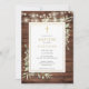 Apresentando luzes de cordas e delicadas folhas de cor d'água verde sobre um fundo de madeira rústica, e um elegante crucifixo de ouro, este batismo chic neutro em relação ao gênero ou convite batizante pode ser personalizado com suas informações especiais. Projetado por Thisnotme©