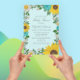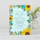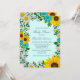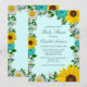 Convite russo para chás de fraldas, com girassóis vibrantes, margaridas brancas tradicionais e flores lacrimogêneas contra um fundo aquoso leve com sopro de bebê e sotaques botânicos verdes