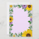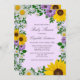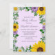 Convite russo para chás de fraldas com girassóis vibrantes, margaridas brancas tradicionais e flores roxas coloridas contra fundo roxo claro com sopro de bebê e acentos botânicos verdes