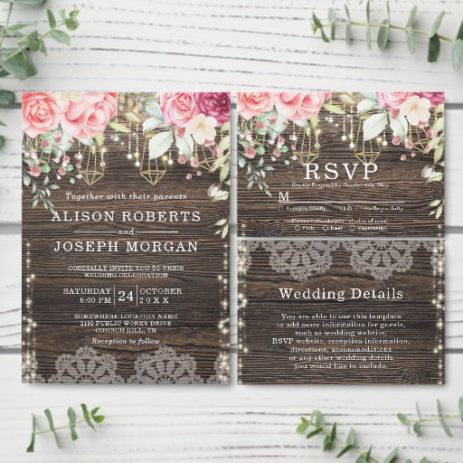 Convite Rústica Wood Floral String Luzes de Casamento Ensa