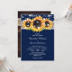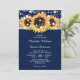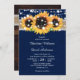 Este convite de casamento floral azul-marinho com girassóis em uma pá e um fundo de renda é perfeito para convidar seus convidados para sua festa de casamento rústica azul marinho inspirada pelas flores de girassol. Fácil de personalizar a modelo.