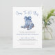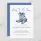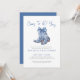 Algo Azul Antes de Eu Me Casar! Convite de Chás de Noiva Elegante com Bota de Cowboy. Celebre a noiva com um toque de charme country e sofisticação. Este convite apresenta um par de botas de cowboy azuis elegantes no topo, adornadas com um grande laço em aquarela. As botas são decoradas com um padrão floral ou inspirado em chinoiserie, adicionando um toque elegante ao tema rústico. A frase "Algo azul antes de eu me casar!" é escrita em uma mistura estilosa de fontes azuis escuras e cinzas, combinando caligrafia manuscrita e tipografia serif clássica para um visual moderno e sofisticado.