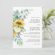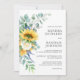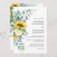 No encantador estilo de boho, este adorável design de convite para o casamento apresenta um buquê sem carinho de girassóis amarelos e rosas brancas com um verde-roxo de eucalipto. O estilo transmite um encanto rústico casual e a felicidade e alegria que você sente no dia do seu casamento. Se o seu casamento será realizado ao ar livre e em um local de casamento interno, este design funciona lindamente para uma variedade de cenários. Personalize o modelo de texto com os detalhes do casamento.