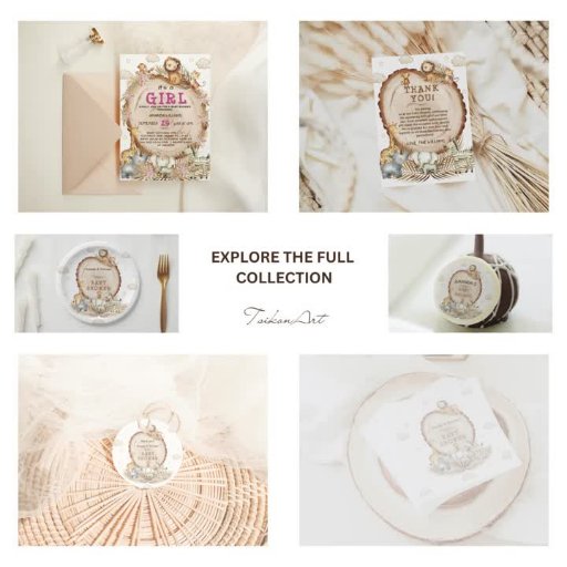 Este convite exclusivo para chás de fraldas boho apresenta uma mistura de sotaques rústicos antigos em tons quentes como bege, fawn e marrom. Os adoráveis animais da selva, incluindo um leão, macaco, tigre, zebra, rinoceronte, elefante e girafa, adicionam um toque lúdico. As gramíneas e palmeiras elegantes complementam o fundo da fatia de madeira, criando uma atmosfera acolhedora e convidativa.