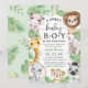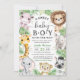Celebrate the upcoming arrival with our "Safari Animals" Boy Baby Shower baby shower invitation! The design features a group of adorable jungle animals and rustic tropical greenery leaves, perfect for a unique safari-themed baby shower. Personalize your invites today and start the celebration!