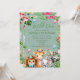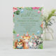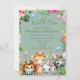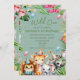 O convite de aniversário do primeiro aniversario Safari Wild One Floral Kids apresenta um fundo verde e designs de aquarelas bonitinhas de um leão, girafa, elefante e chapéus de festa de visto de zebra, cercados por flores da selva selvagem. Você pode personalizar o nome do seu filho e o aniversário.