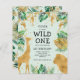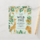 Celebre o seu primeiro aniversário selvagem com este convite temático de safari da selva, com folhas falsas de ouro (girafa, leão e macacos), folhagem dourada e selva verde, e aspersão de confete de ouro. Adicione o nome do seu filho e os detalhes da festa em texto preto sobre um fundo verde pálido. Um padrão de folhagem da selva em verde e ouro decora a parte de trás da carta.