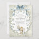Charming watercolor baby squirrel with blue bow on soft sage green gingham background, framed by delicate forget-me-not florals and leafy wreath. Perfect gender-neutral invitation for a whimsical woodland or cottagecore baby shower. Fully customizable – edit text, colors & more!