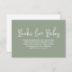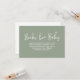 Elevate your baby shower with our "Modern Script Sage Green Baby Shower Book Request Enclosure Card". This elegant card features a contemporary script font in soothing sage green, adding a touch of sophistication to your event. Encourage guests to bring books instead of cards by including this enclosure card with your invitations. *digital download available