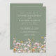 Elevate your wedding with this elegant design featuring soft sage green backgrounds on both sides, creating a calm and timeless base that works beautifully from spring through autumn. The invitation highlights a refined floral border along the bottom, featuring muted pastel blooms in soft pink, blue, purple, yellow, and orange tones, gently accented with delicate greenery for a serene, garden-inspired look.