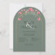 A gorgeous wedding invitation, arch shaped with a gold color arch frame on a sage green background.