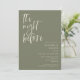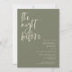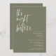 Um convite minimalista de janto de ensaio de casamento com uma letra moderna que diz "na noite anterior". A cor de fundo é verde-sábio.