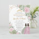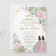 Este convite para a Quinceañera apresenta uma imagem geométrica com brilho dourado adornada pela delicada cor d'água verde, verde rosa pálido, verde sensual macio e uma garota com um lindo vestido verde sábio e outra garota com um bonito vestido cor-de-rosa. Personalize-o com seus detalhes de forma fácil e rápida, basta pressionar o botão personalizar para reorganizar e formatar o estilo e a colocação do texto. Também excelente para Sweet 16! c) O Feliz Cat Studio