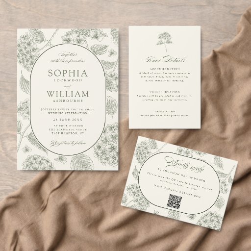 The invitation boasts a harmonious blend of sage green and soft ivory, evoking a sense of tranquility and romance. This color scheme perfectly complements the hydrangea motif and adds to the overall vintage allure.