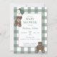 If you can "bearly" wait for the arrival of baby boy, customize this shades of sage green, creme, and white buffalo check (plaid), teddy bears, ribbon bows, and balloons baby shower invitation. The back of the card features the same gingham background.