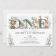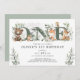 Este elegante convite para primeiros aniversarios apresenta cor d'água macia verde, animais florestais adoráveis e cartazes modernos. Adequado para rapazes e raparigas!