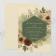 An artistic display of watercolor botanicals creates a warm, rustic ambiance. Soft washes of sage green blend with creamy ivory, highlighting floral arrangements in deep russet tones. Delicate anemone-style blossoms, sprigs of wild greenery, and clusters of berries come together in a charming, earthy composition for a bohemian-inspired affair.