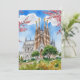 Este postal apresenta um retrato de cor d'água da Sagrada Família em Barcelona, Espanha.
