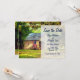 Este anúncio de casamento Save the Date apresenta um celeiro rústico com uma bandeira americana patriótica em um cenário campestre arborizado encantador.