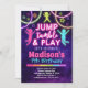 Salta e brinca com um convite de aniversário de trampolim Park em cores brilhantes do arco-íris para meninas e meninos.