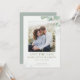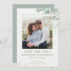 Cartão elegante de "save the date" de casamento com eucalipto em aquarela, frente e verso. Com folhas de eucalipto pintadas em aquarela. Este modelo de design apresenta um layout para uma foto.