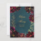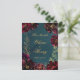 Um convite de Salvar a Data de casamento em tom de joia azul teal com uma sinfonia de peônias vermelhas bordeaux profundas adornadas com spray dourado e contornos dourados brilhantes reunidos em torno de um fundo de lavagem de aquarela azul teal profundo com seus nomes em letra cursiva rústica dourada e uma fonte sem serifa maiúscula pequena anunciando seus detalhes.