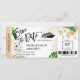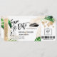 Destino Casamento na Praia Passagem de Embarque Bilhete Ouro Avião Salvar a Data com ícone de Navio de Cruzeiro com folhas tropicais
