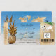 Passagem de Embarque do Casamento na Praia de Destino Bilhete de Avião Dourado Salvar a Data com ícone de coração e avião com abacaxi