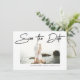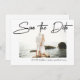 Guarde o Anúncio de Casamento de Data. Texto do script de escrita manual de traçado de simplicidade moderna de caneta sobre fotografia centrada. Areias molhadas opcionais. Layout totalmente versátil do estilo do faça-você-mesmo. Ajuste facilmente o tamanho, estilo e posicionamento de todos os elementos de texto. O filtro de névoa branca é usado para exibição, mas você pode removê-lo ou alterá-lo clicando no modo Personalizar avançado.